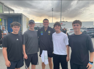 Jacob Hopper, pictured centre, with SPC boarders. Photo: SPC Boarding - Great to see our current boarders also catching with former SPC boarder and Tigers midfielder Jacob Hopper (SPC 2014-15) recently!